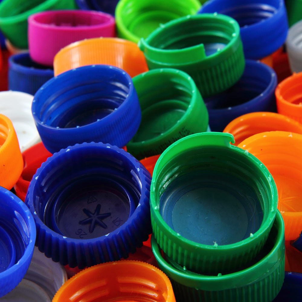 Tapas de plástico recicladas fabricadas en polipropileno (PP), provenientes de botellas retornables post-consumo. Este material se presenta en formato industrial y está destinado a empresas dedicadas al reciclaje, reprocesamiento y fabricación de nuevos productos plásticos.